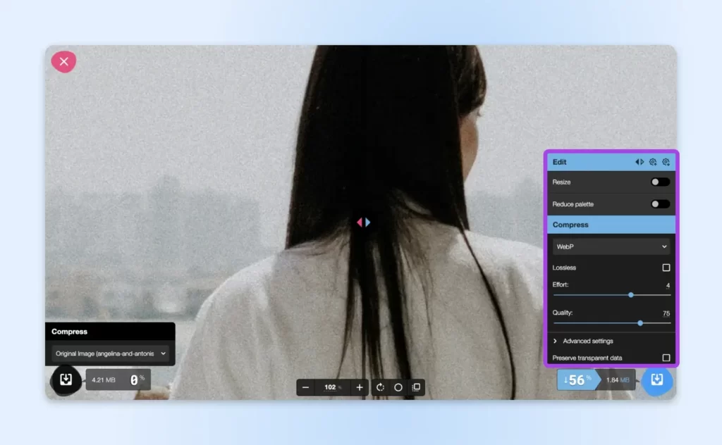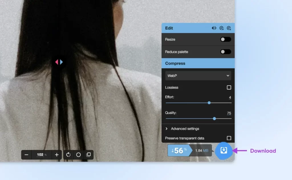 当你选择不同的选项时,可以移动屏幕中间的滑块来查看对图像质量的影响。左边是原始图像的放大视图;右边是压缩版本的预览。