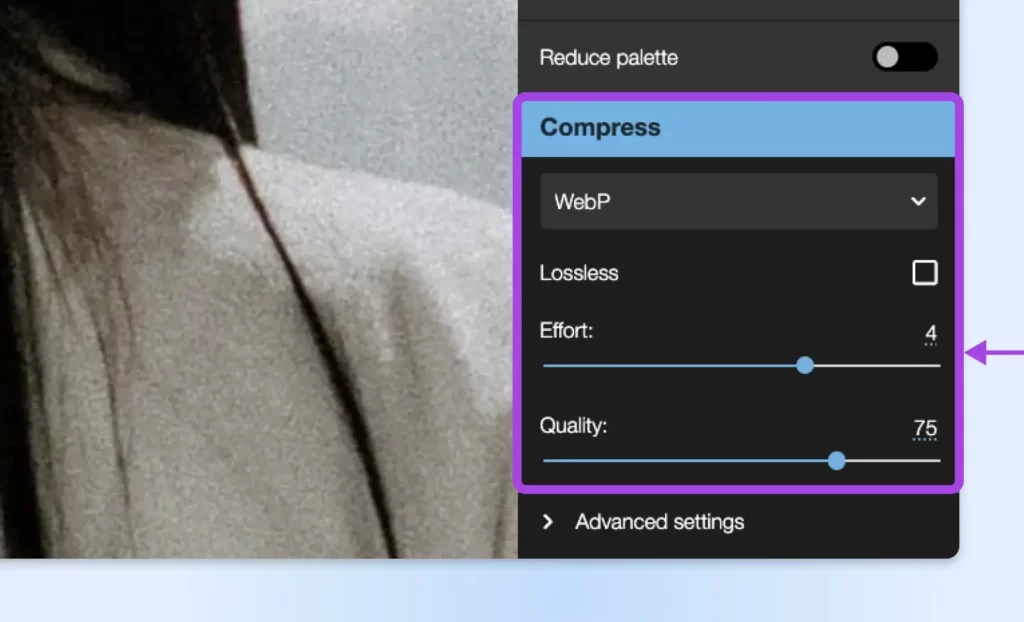 - Reduce Palette: 你的图片包含多少种颜色?如果很简单,向左移动 Reduce Palette 滑块就能节省很多空间。
