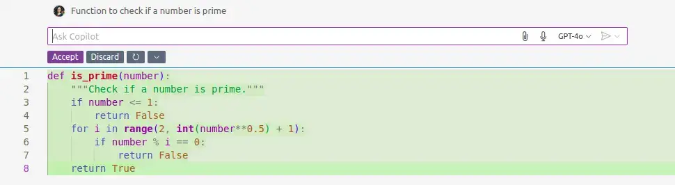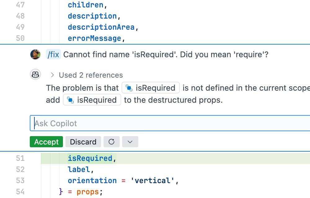 Copilot 还能帮助你改进代码并了解其上下文。它可以重构函数,提出改进建议(如添加错误处理),提高可读性,甚至为函数或类生成文档。你可以使用 /fix 命令获取解决错误或警告的建议,帮助你更快地解决问题。