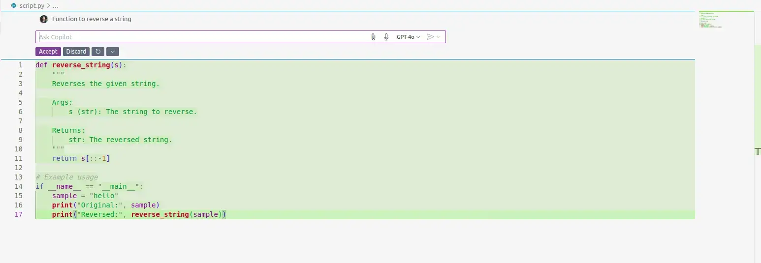 Copilot 会在你输入代码时提出建议。它会分析你正在处理的文件和其他相关文件,从而提出智能建议。例如,当你开始输入一个方法时,它会根据你的编码风格预测代码的其余部分。