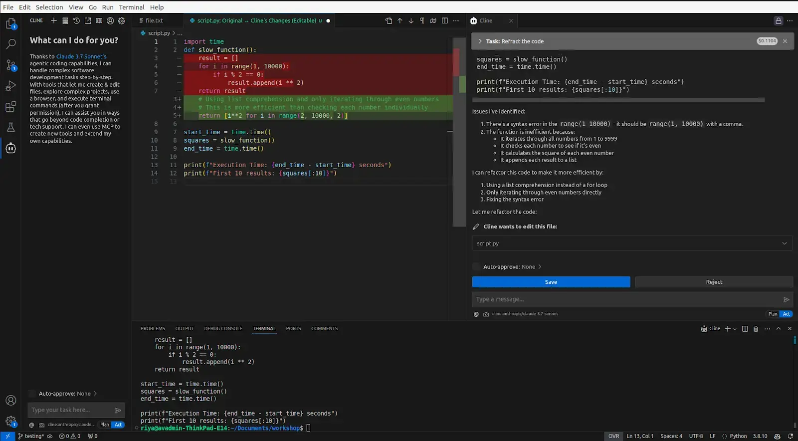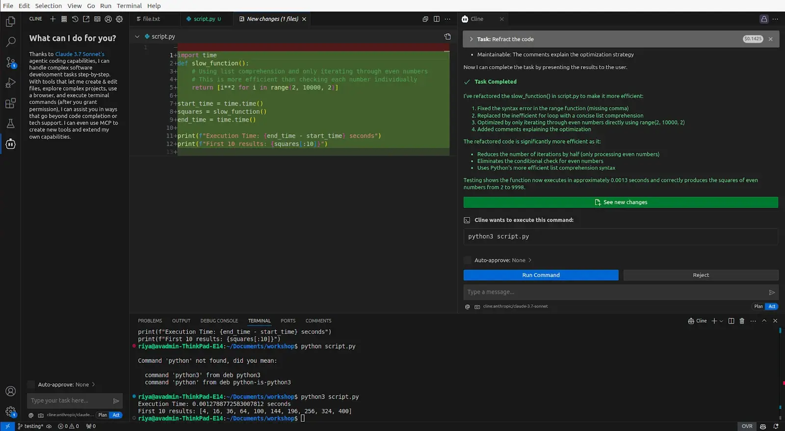 使用 Cline AI 重构和优化 Python 脚本,提高其效率和可读性。