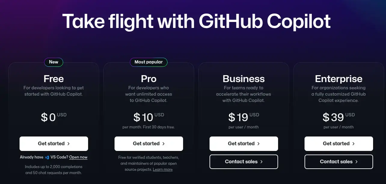 GitHub Copilot 的个人计划月费为 10 美元,提供 2,000 个人工智能代码生成点数,并可完全访问其智能代码建议系统。每月 19 美元的商业计划将信用点数增加到 5000 个,并增加了团队协作功能、增强的安全性和优先支持。这种方式既支持个人开发者,也支持专业团队。