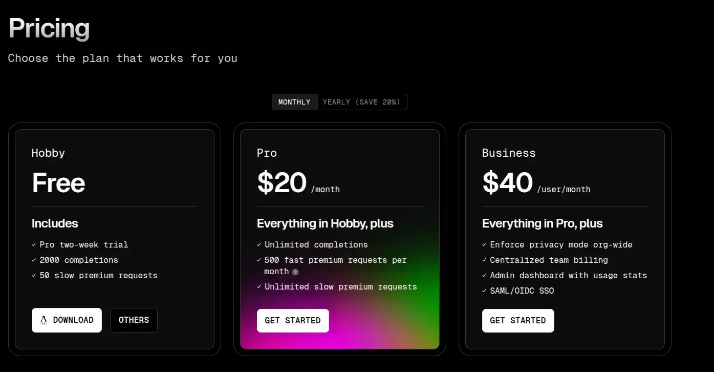 Cursor 提供基本功能的免费计划,高级计划起价 20 美元/月,可访问高级人工智能功能。