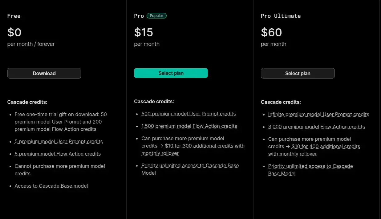 Cursor 提供每月 500 个人工智能代码建议点数的免费版本,为开发人员提供基本的人工智能辅助功能。高级计划的价格为每月 15 美元,提供 5000 个人工智能代码建议点数。该级别包括高级 AI 功能、完整的云存储和增强的代码建议,可满足更复杂的编码需求。