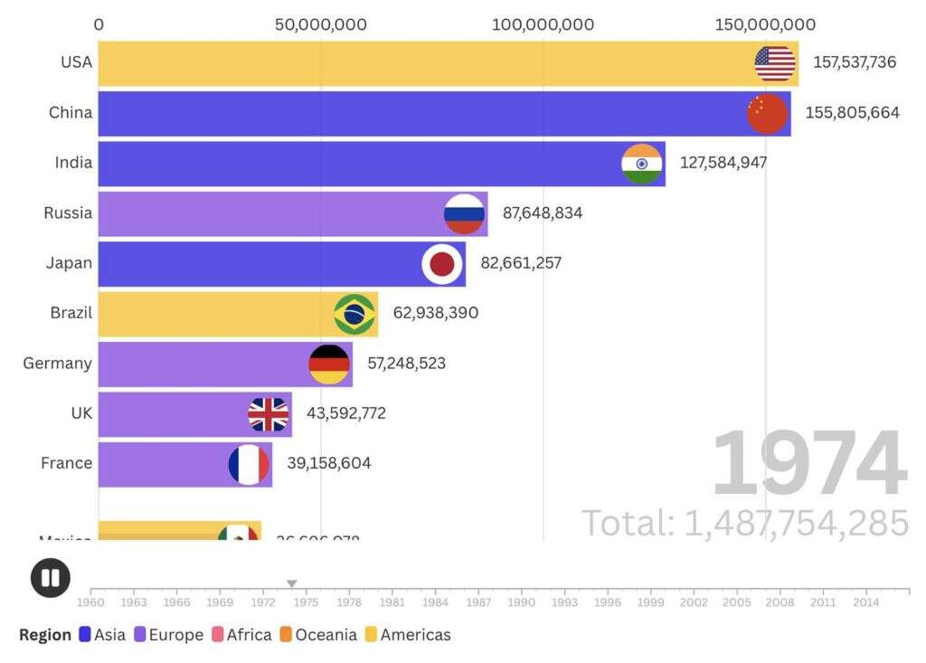 但什么时候应该选择竞赛条形图呢?一般来说,这种图表用于直观地强调随时间发生的变化。例如,从大流行开始到现在,哪些国家进入了前十名–图表将以动画的方式直观地显示数字随时间的变化。