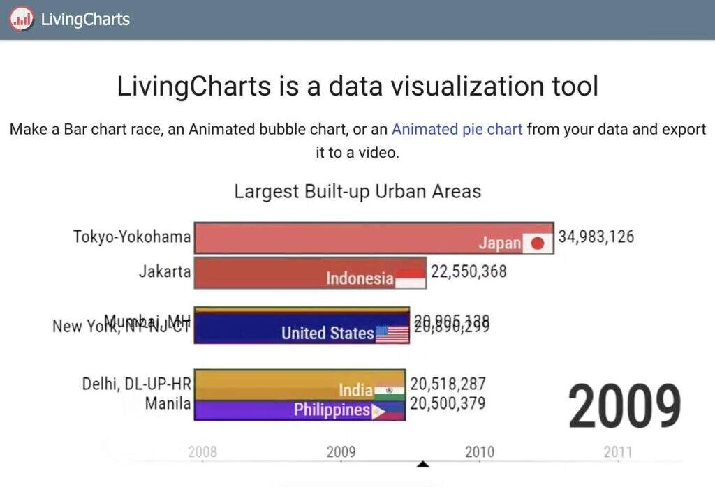 LivingCharts 是一款在线工具,用户无需编码技能即可创建竞赛条形图等可视化数据动画。通过导入数据,您可以自定义动画,并将其直接导出为视频文件或嵌入到网站中。该工具旨在简化将复杂数据转化为引人入胜的可视化故事的过程。