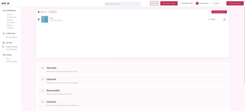 要使用 DeepImage 去除背景,必须先注册一个账户。注册后,你可以通过拖放或从 Google Drive 导入图片的方式轻松上传图片。该工具提供多种图像编辑功能,包括移除背景、放大、增强面部细节、锐化和降噪。