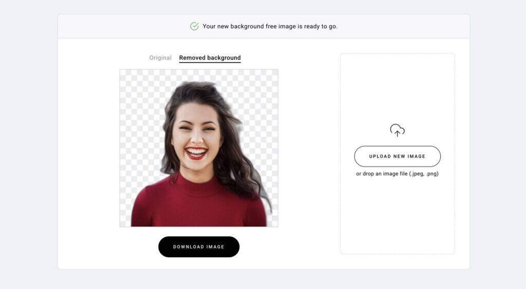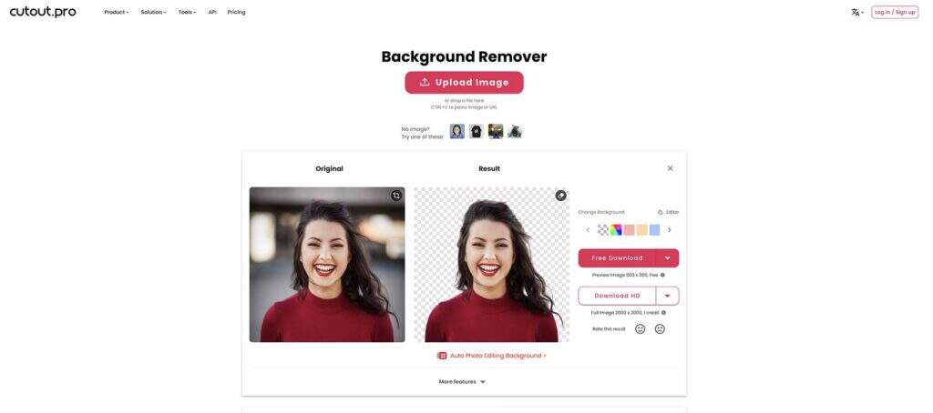 Erase.bg 可处理最大 5000×500 像素的图像。使用时,只需拖放一张图片即可。处理完成后,您将进入一个结果页面,显示原始图像和去掉背景后的图像对比。