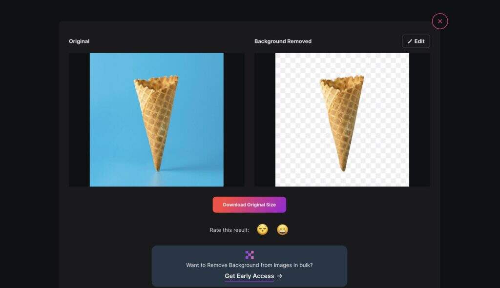 为确保背景移除过程成功并满足您的期望,系统提供了一个方便的 “比较 ”按钮。通过该功能,您可以快速查看原始图像与去除了背景的编辑版图像的并排对比。