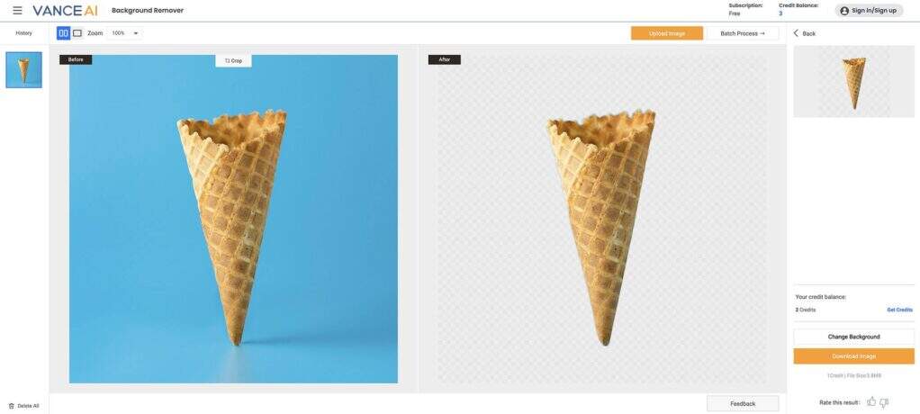 VanceAI 的背景移除器是一款简单易用的工具。首先,将所选图片拖到页面上,然后点击“Start to process”按钮。不久后,经过处理并去除了背景的图片就会出现在屏幕右侧。
