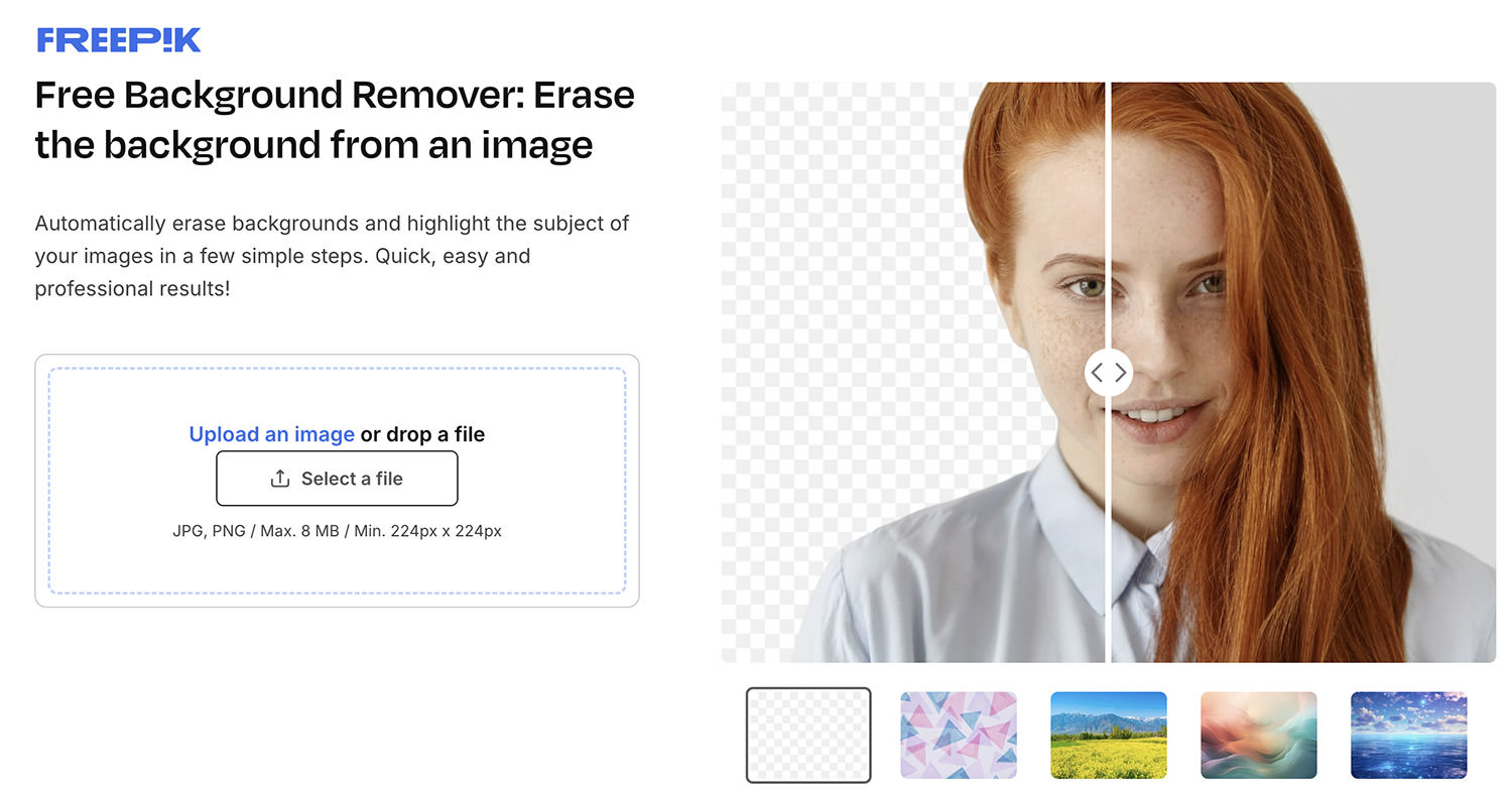 使用背景移除器非常简单。通过拖放或从设备中选择图片来上传图片。点击 “Remove bg ”按钮,AI 会在几秒钟内自动移除背景。你可以使用画笔工具细化边缘或调整效果。完成后,你可以下载编辑好的图片,或用 AI 生成的选项、Freepik 的视觉图片或你自己的图片替换背景。