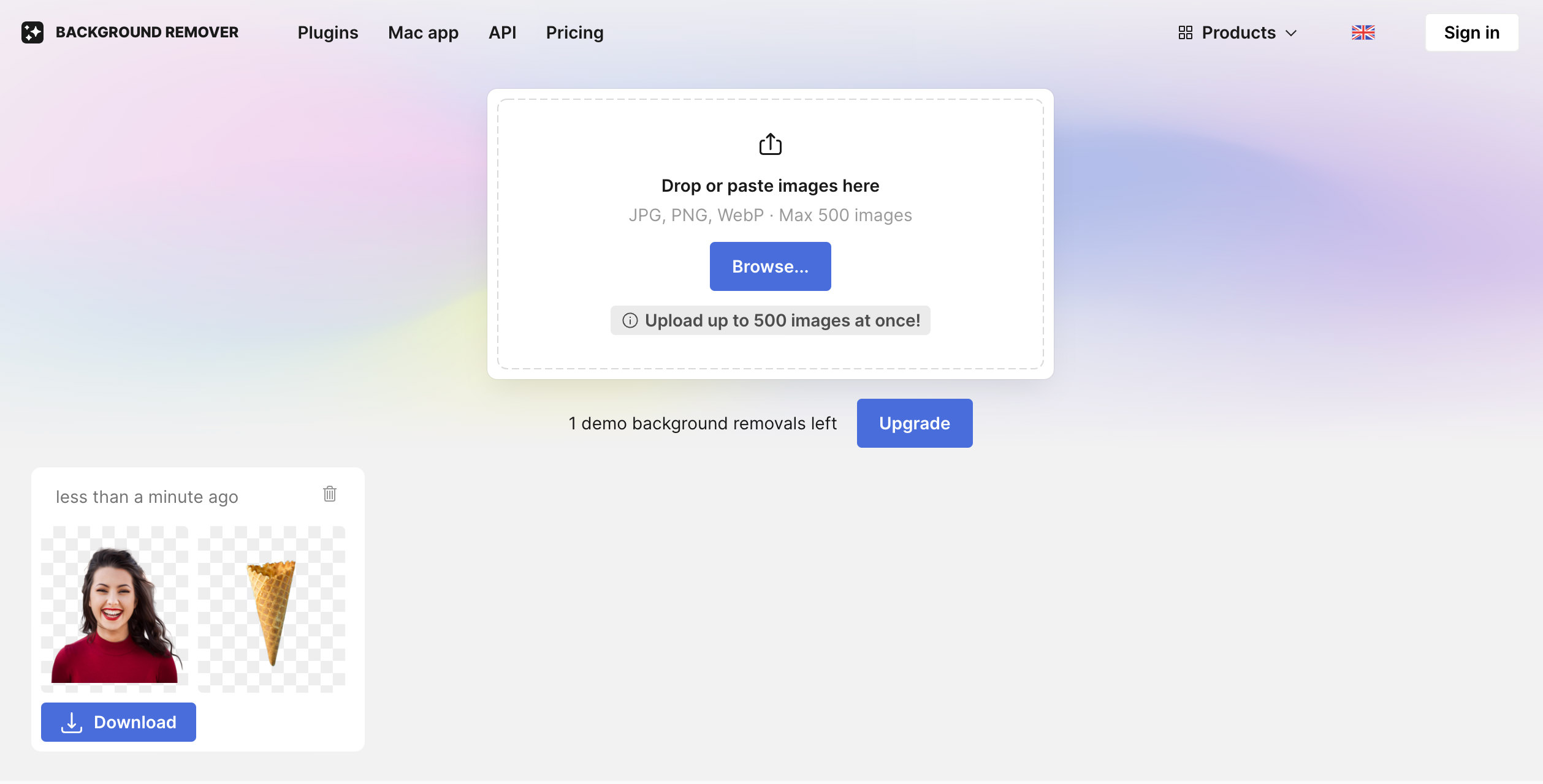 Icons8 背景去除器拥有友好的用户界面,只需单击鼠标,即可轻松移除图片背景。它支持同时批量上传多达 500 张图片,格式包括 JPG、PNG 和 WebP。只需将照片上传到背景移除器,剩下的就交给人工智能来完成吧。该工具无需创建账户即可使用,最多可为三张图片提供免费背景移除服务。