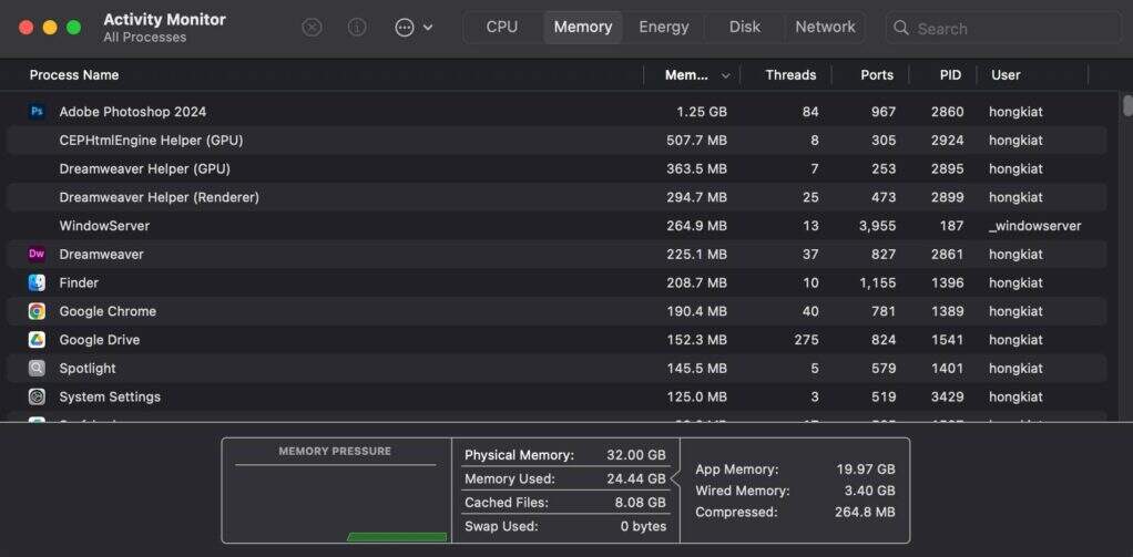 - 查看 内存选项卡,看看是否有应用程序占用了过多内存。如果 Mac 内存不足,运行速度就会减慢,因此关闭高内存应用程序可能会有所帮助。