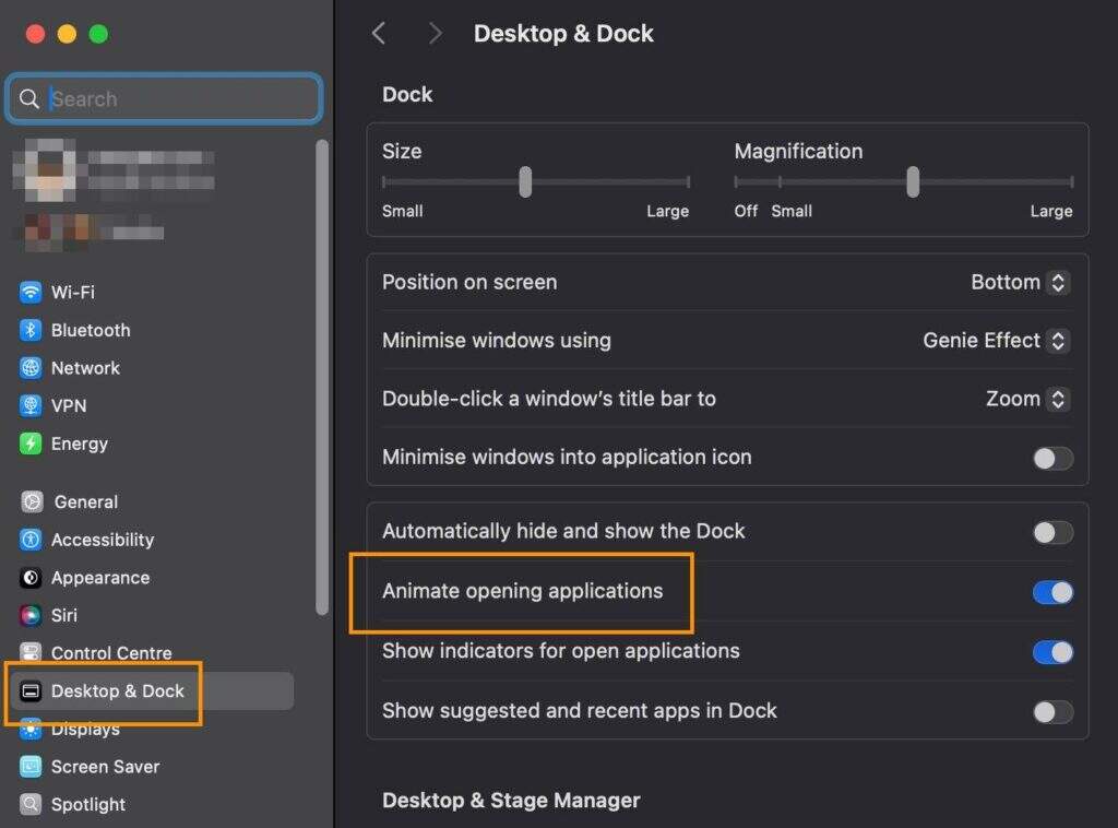 - 你还可以进入“系统设置”中的“桌面和程序坞”,取消选中 “弹跳打开应用程序”,从而在启动应用程序时获得更流畅、资源占用更少的体验。