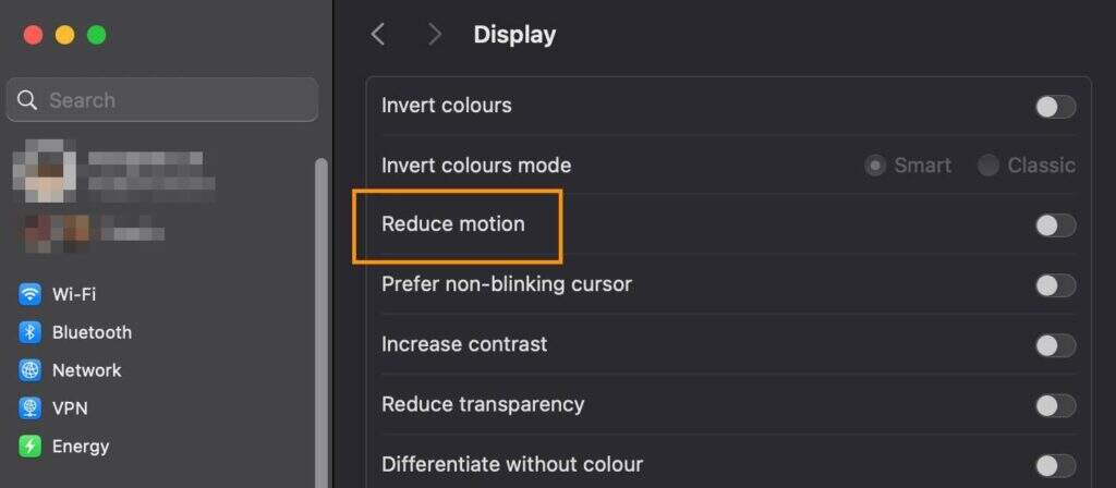 - 在“显示”下,切换“减弱动态效果”以减少动画。