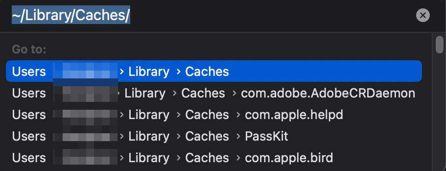 - 选择转到文件夹…,然后输入~/Library/Caches并按 Enter。