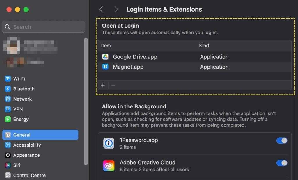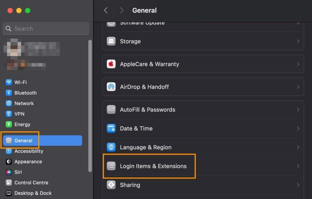 - 从侧边栏中选择“登录项和扩展”。