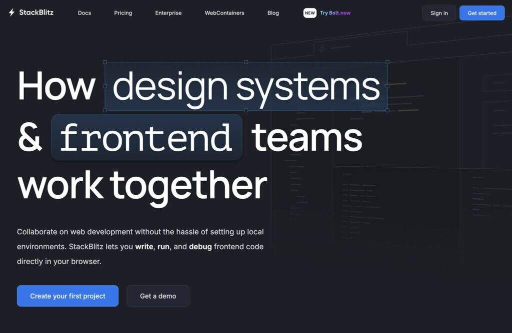 StackBlitz 是一款专为 JavaScript 和 TypeScript 开发定制的云 IDE。如果您正在使用Angular、React 或 Vue 等框架,它将是您的最佳选择,因为它已针对这些框架进行了优化。StackBlitz 可让您立即开始编码,并实时预览您的工作,为您提供快速反馈。
