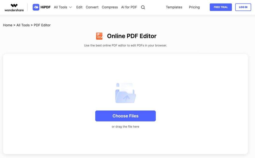 要开始使用,只需将 PDF 文件上传或拖入 HiPDF 界面即可。文件上传后,您可以使用各种直观的工具轻松添加文本、图像、形状甚至签名。