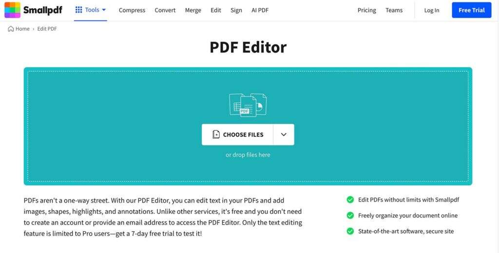 Smallpdf 的与众不同之处在于其友好的用户界面,而且您无需创建账户或提供电子邮件地址即可使用其编辑功能。