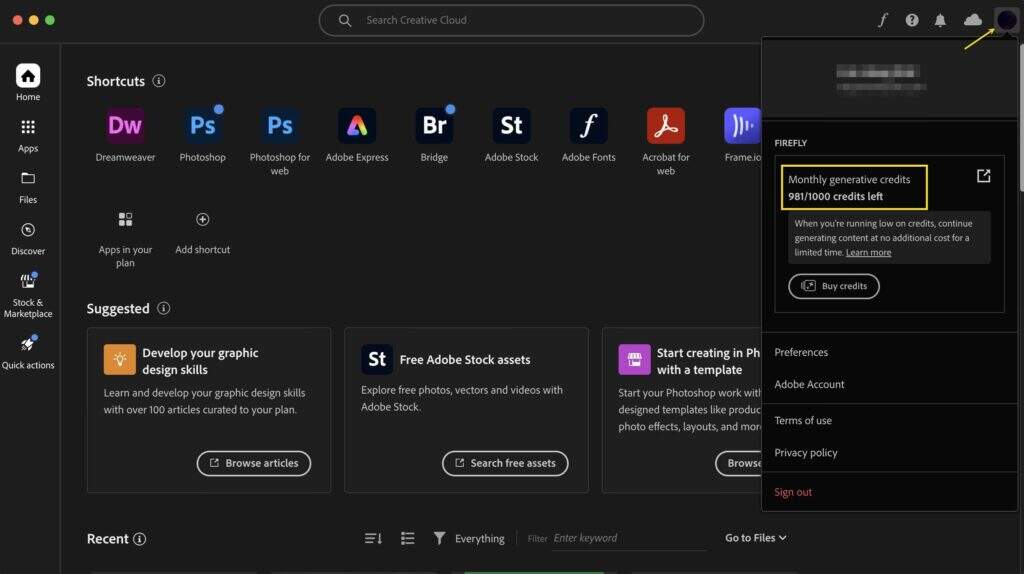 要查看您的生成点数,请打开 Creative Cloud 应用程序,点击右上角的账户图标,查看您还剩下多少点数。