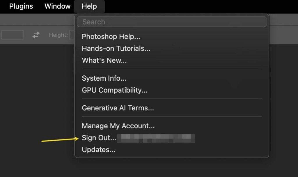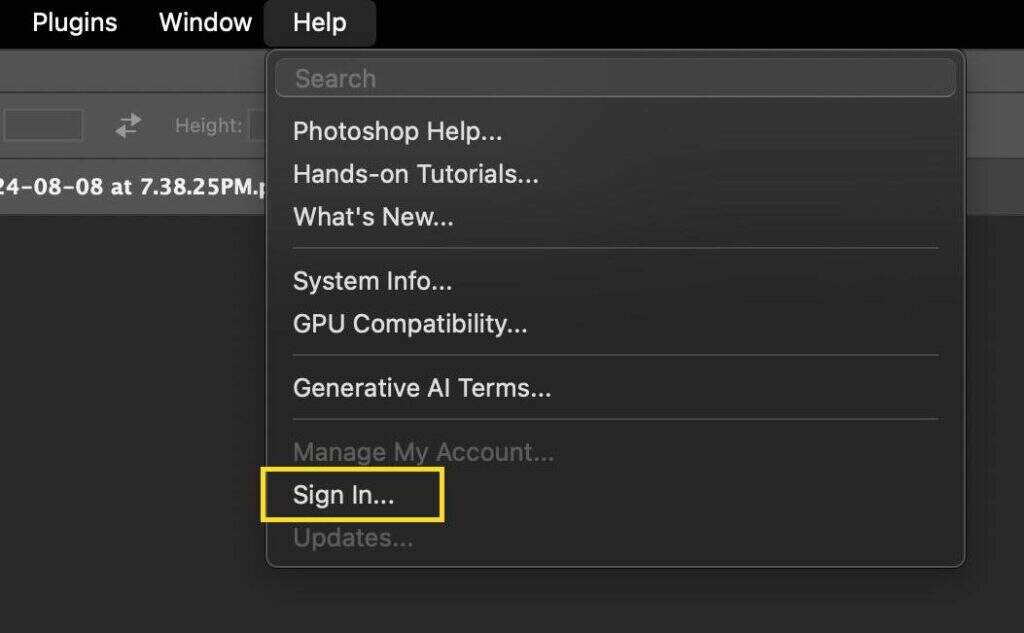 要确保已登录,请在 Photoshop 中转入 Help,然后单击 Sign In…(如果尚未登录)。