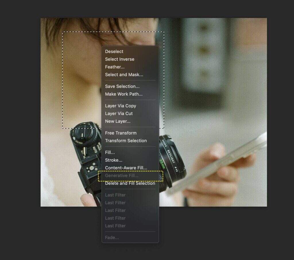 即使选中了某个区域,右键菜单中的 Generative Fill 也是灰色的