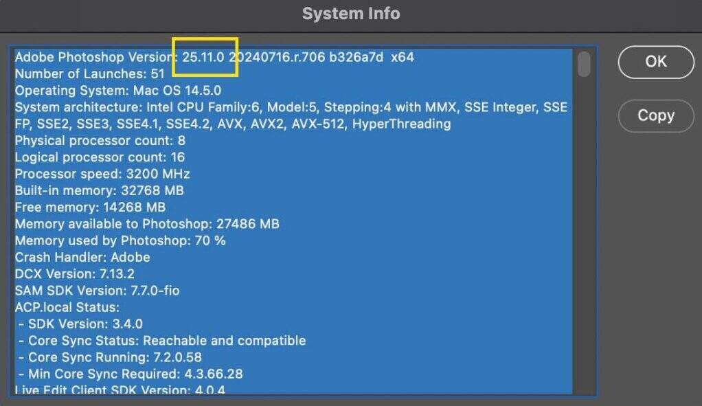 要检查是否使用了支持 Generative Fill 的正确版本,请在菜单栏中导航至 Help > System Info。