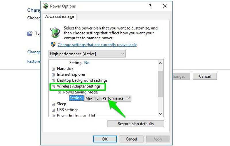 - 展开 “无线适配器设置“,然后选择 “省电模式“。