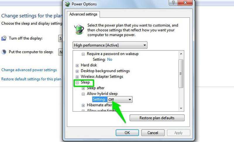 - 现在从下拉菜单中选择 “关闭”,混合睡眠功能将被禁用。