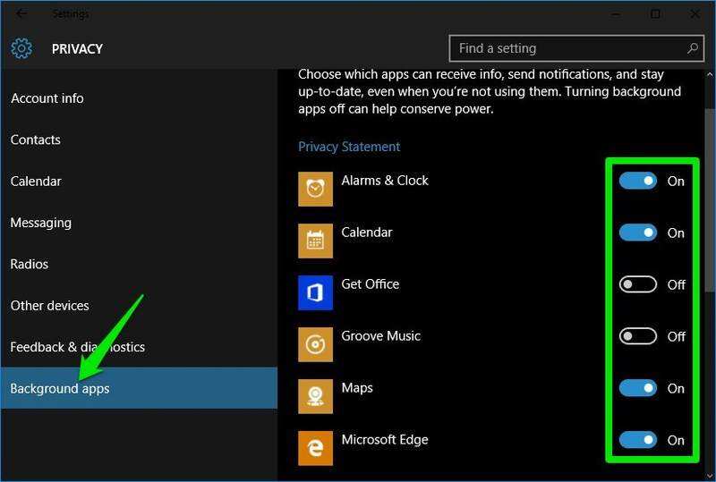 - 在此选择所有不使用的 Windows 10/11 应用程序旁边的 “关闭”。