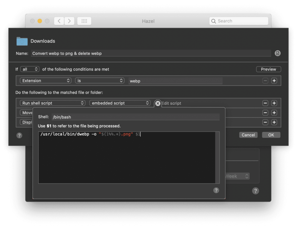 所有这些在 Hazel 中都很容易配置。你需要的是以下嵌入式脚本: