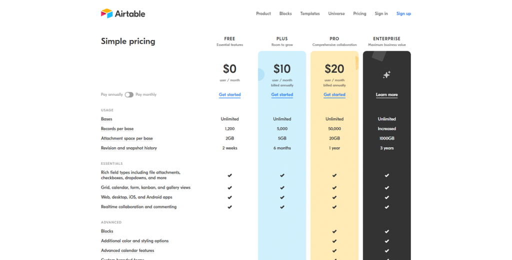 免费计划包括 1,200 行和 5GB 存储空间。附加计划起价为每位用户每月 10 美元。