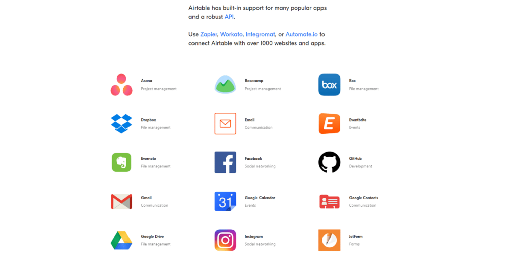 Airtable 通过其应用程序接口实现了 32 种原生集成,但通过 Zapier 和其他集成 SaaS 解决方案,还可支持超过 1,000 种集成。
