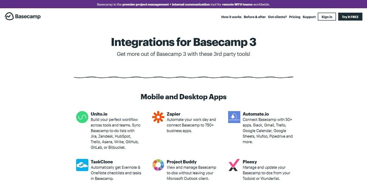 Basecamp 3 通过其应用程序接口实现了 45 种以上的本地集成,并通过 Zapier 和 Automate.io 实现了更多集成。