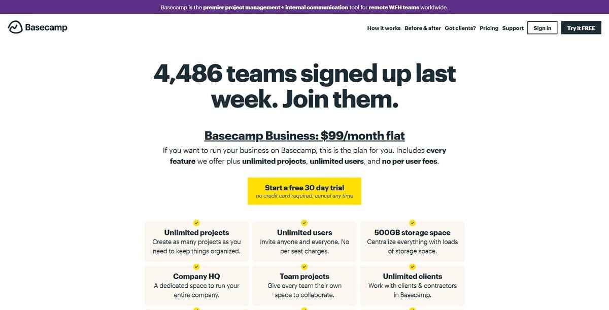 Basecamp 采用统一价格,每家公司(非用户)每月 99 美元,提供 30 天免费试用。
