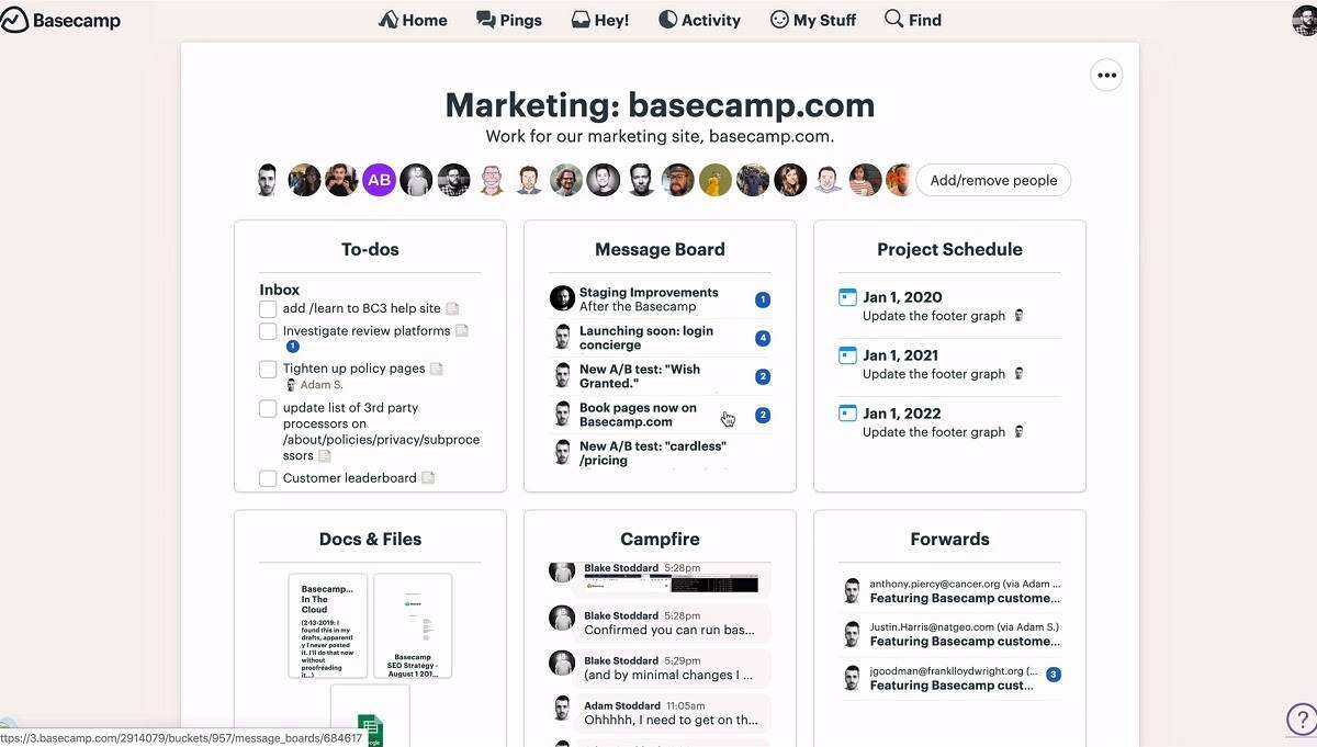 Basecamp 将公司划分为多个团队或项目。在个人团队视图中,您可以访问留言板、待办事项列表或篝火即时聊天。