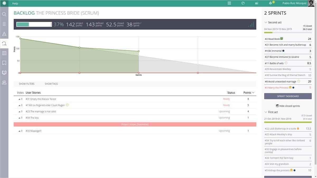 除了简单的看板视图,Taiga 还提供先进的 Scrum 和冲刺工具,比如这个冲刺绩效的积压视图。