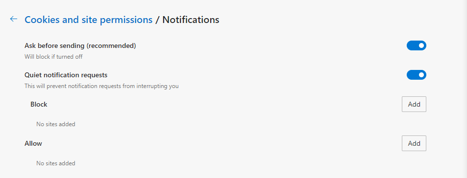 在下一屏幕中,如果你想完全关闭 Edge 中的推送通知,请禁用 “发送前询问” 选项。