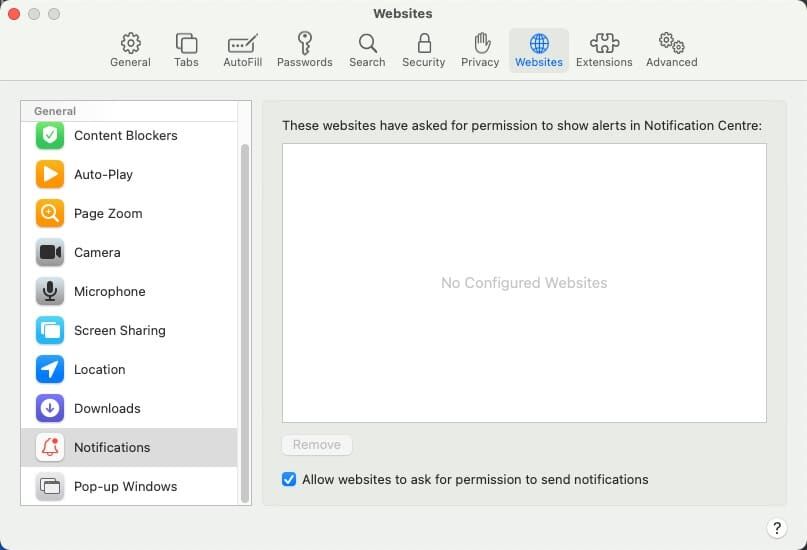 要对弹出警报和信息进行更多控制,请单击 “通知” 选项右侧的 “设置” 按钮。这时会打开一个窗口,列出所有请求向你发送推送通知的网站: