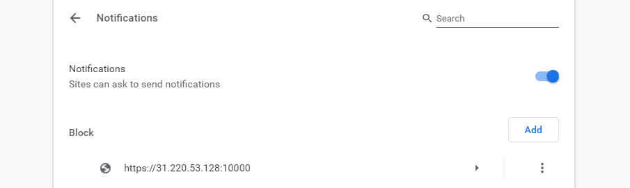 点击 “添加” 按钮后,Chrome 浏览器会让你输入要屏蔽通知的特定 URL。还有一个对应的白名单网站设置,你可以通过滚动到屏幕底部来进行设置: