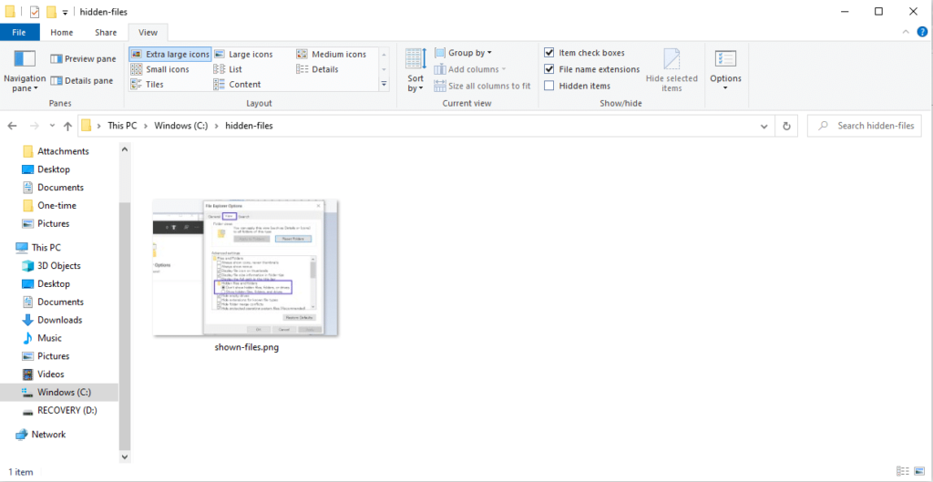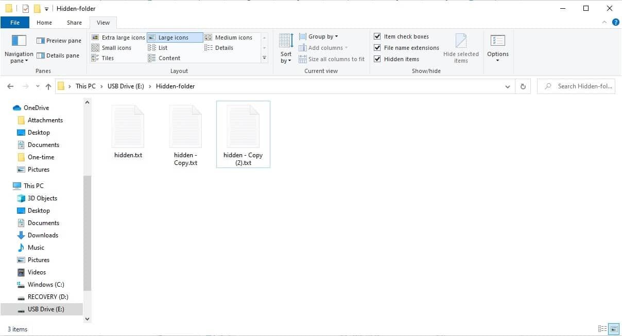 首先,打开文件资源管理器(WIN + E),转到您认为有隐藏文件的文件夹。然后,单击 “View” 选项卡,选中 “Hidden items” 文本旁边的复选框。