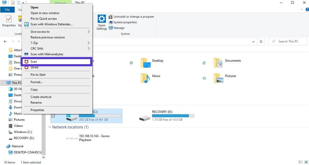 或者在文件资源管理器中右键单击要检查的文件夹,然后选择扫描选项。