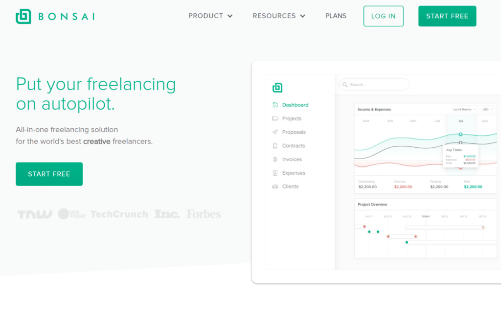Bonsai 的前提是让自由职业者的一切都变得简单,这也是为什么有超过 3 万名自由职业者使用这款工具的原因(2016 年为 1 万名!)。Bonsai 的创始人马特-布朗(Matt Brown)和马特-尼什(Matt Nish)分享说,Bonsai 的用户比使用其他工具的用户平均快两周拿到报酬,比使用该工具前减少了 3 倍的逾期付款。