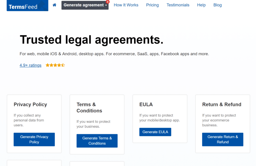 Termsfeed 可帮助生成法律文档,如隐私政策、条款和条件、服务条款、退货政策等。