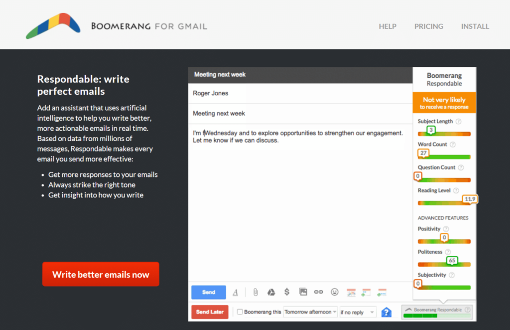 Boomerang 有助于保持电子邮件沟通。它的主要优点是能安排在最佳时间发送电子邮件。你可能会在周末完成很多工作,但又不想让客户习惯于你在 “空闲 “时间回复他们 – 所以可以使用 Boomerang 来起草待回复的邮件,然后将它们安排在正常工作时间内发送!