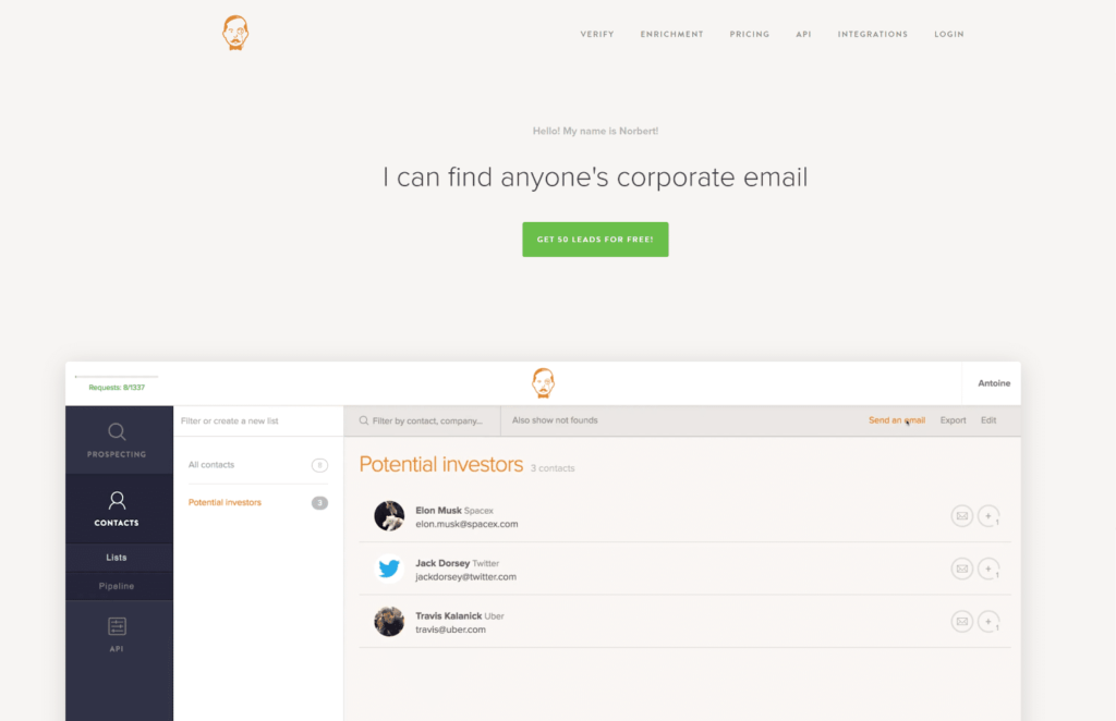 根据 Ahrefs,Voila Norbert 被选为最准确的电子邮件查找工具。Norbert 还有一个电子邮件验证工具,允许你上传电子邮件列表,并在短时间内获得结果。无论您是想接触有影响力的人,还是想建立营销关系或接触潜在的新员工,Norbert 都能帮您实现。