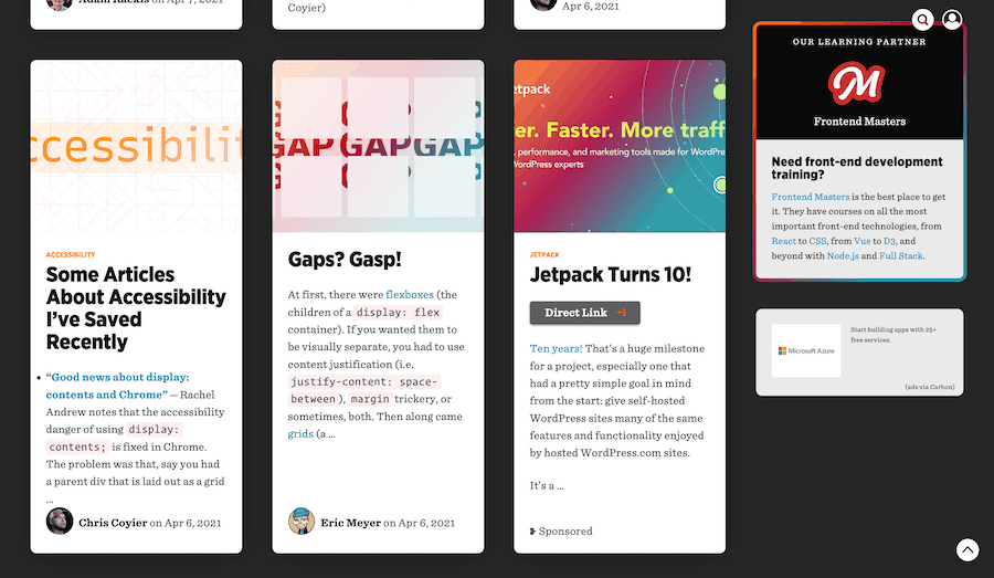 正如关于页面所指出的,在最初的几年里,CSS是主要的话题。不过,从那时起,HTML、JavaScript、WordPress等变得同样重要且经常被讨论。结果是一个专注于前端开发的网站,其中包含大量文章、视频和指南来激发您的灵感。