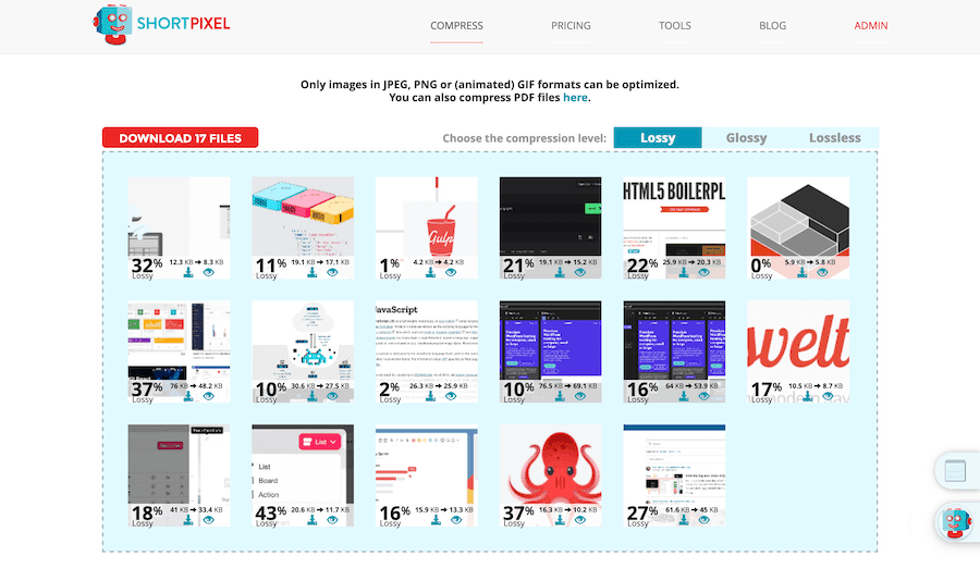 ShortPixel在引擎盖下有大量的功能。有三个级别的压缩,一个很棒的PDF优化器,甚至一个GIF压缩器。后者是您在许多其他工具中找不到的东西,因此它是产品线的一个受欢迎的补充。