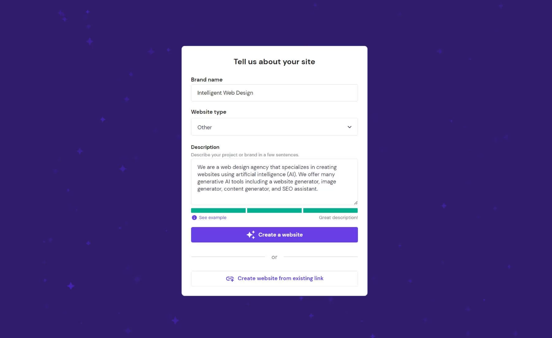 Hostinger AI Website Builder 可以利用人工智能的力量轻松生成、定制和发布一个全新的网站。使用人工智能建立网站的初始过程只需 1 分钟左右。只需填写几个表单字段,告诉生成器有关您网站的信息,然后点击按钮即可。